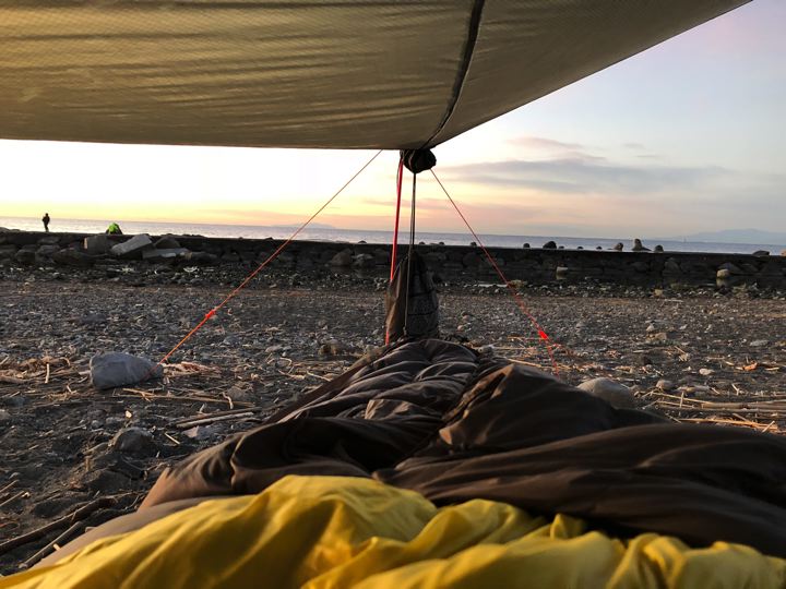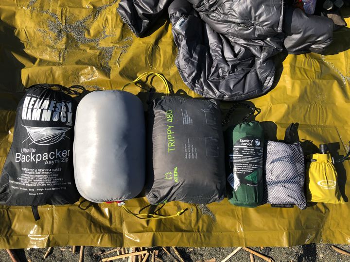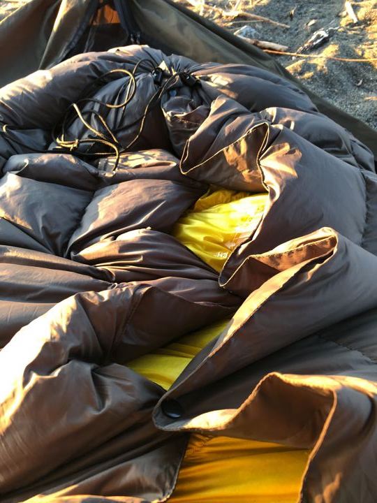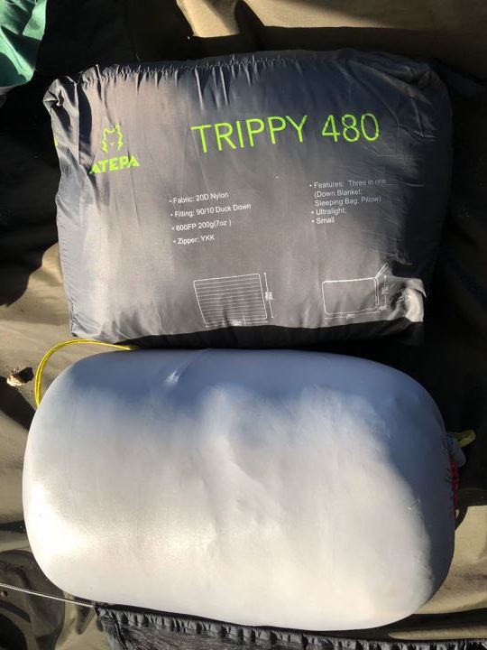 今回のシュラフは、モンベルダウンハガー#2(女性用)にアテパのTRIPPY480をブースト。アテパのホック留めが最高。こうしてみるとモンベルも結構小さくなりますね。