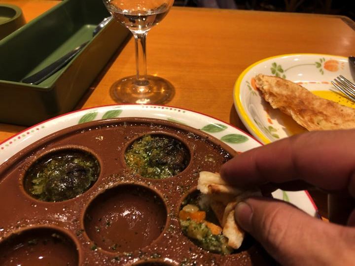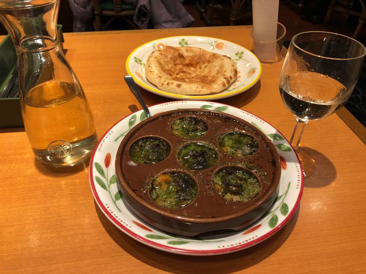 モーニング用豚汁をディナーの〆にスライドし、ランチ用カップヌードルをモーニングにスライドしてしまったので、途中でサイゼランチ。もちろんいつもの様に100円白ワインにエスカルゴ。
