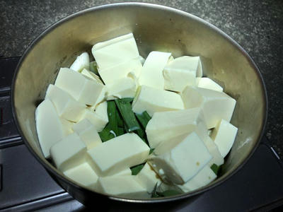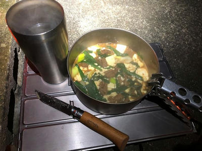 ローソンさんに売ってるホルモン鍋が再登場。ちょっと味が濃いから、お豆腐、ネギ、ニラをブーストします。