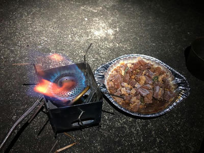 エンバーリットで焚火。アスパラベーコンあてに芋焼酎お湯わりを飲ります。