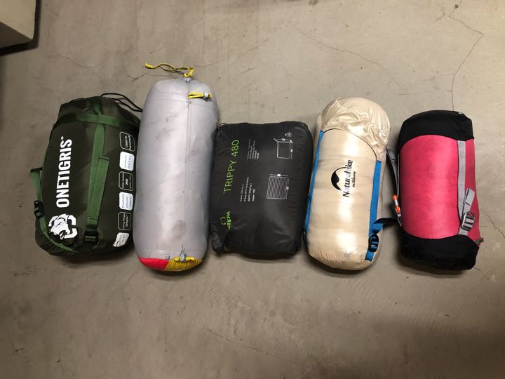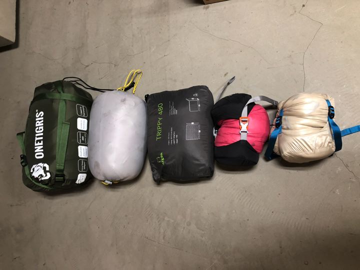 各種シュラフやアンダーキルト類の仕舞の比較。