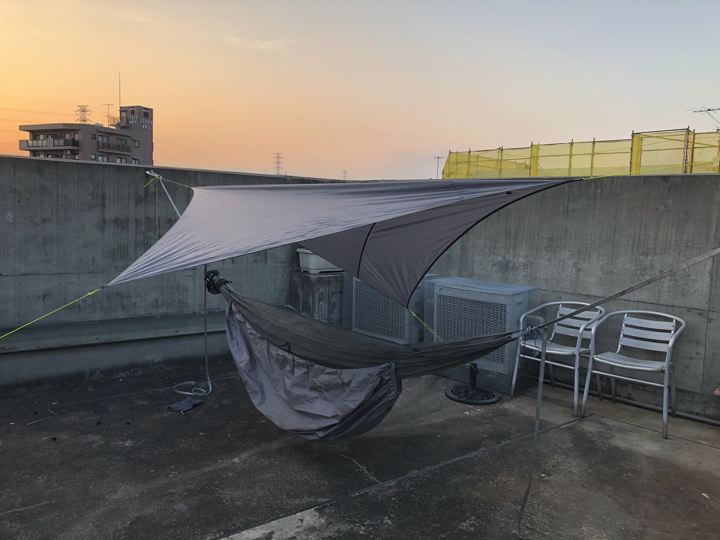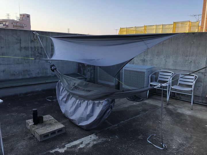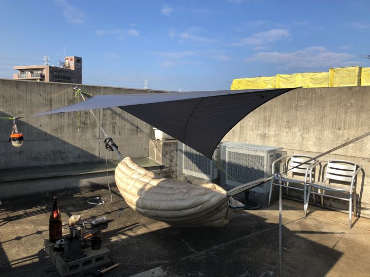 またスケスケハンモックにハンモックウォーマー。タープは激安ギアトップ。