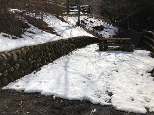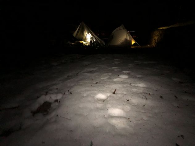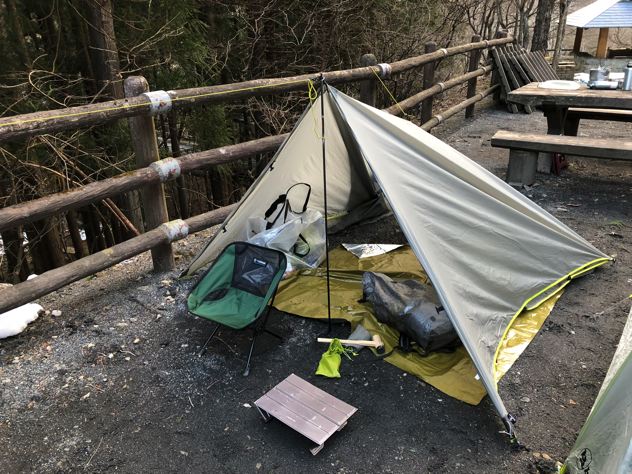 テン場はこんな感じ。やや人工物がありますが雪が残ってていい感じ〜。