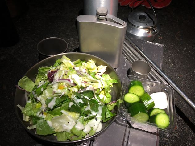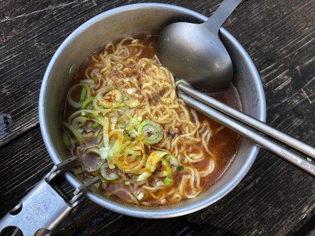 お腹すいたので、設営前に速攻チャルメラ!ストームクッカーの湯ぎり蓋をまな板にして葱カット!