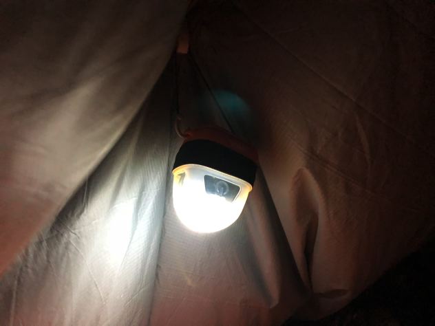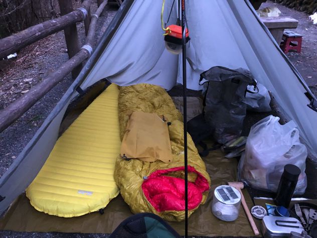 初めてのタープ泊。前面オープンの剥き出しで自信なし。風向き変わって欲しい。寝具はサーマレストネオエアー女性用にモンベルダウンハガー800女性用#2のみ。