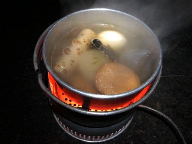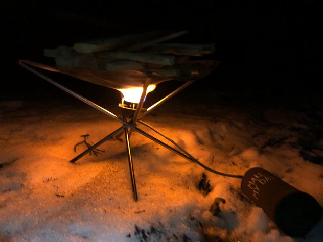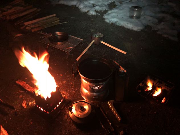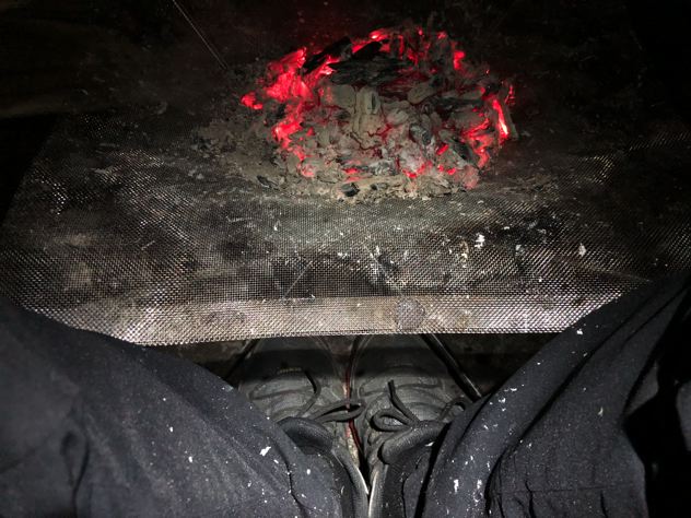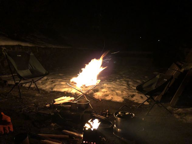 例によって足先が冷たい!ファイヤースタンドの熾火の下で温める。