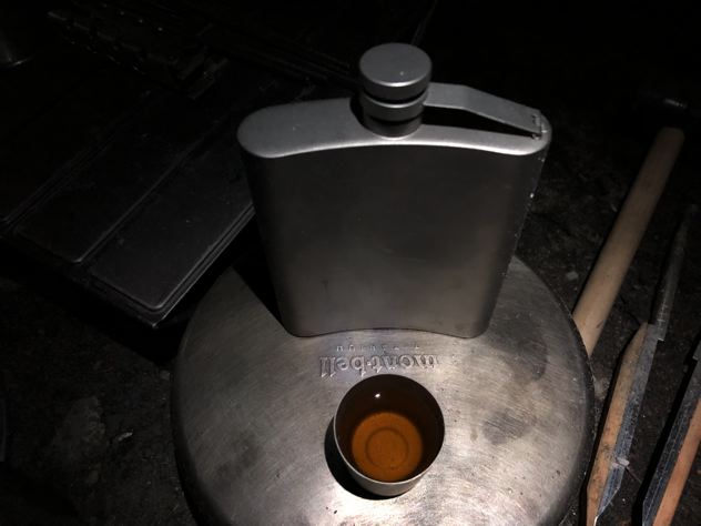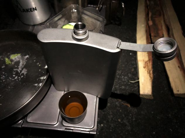色々やりながら、到着したてのチタンフラスコとチタンショットグラスでスコッチウイスキー!く〜っ!こここ、これは、うみゃ〜!