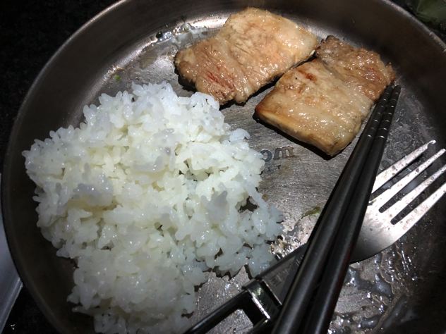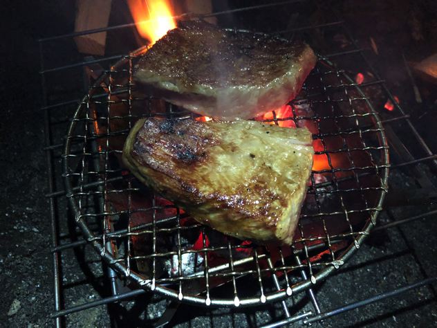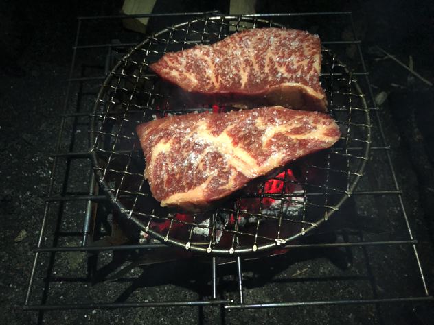 バーゴファイヤーボックスグリルにストームクッカー用の丸網敷いて焼肉開始。