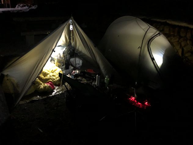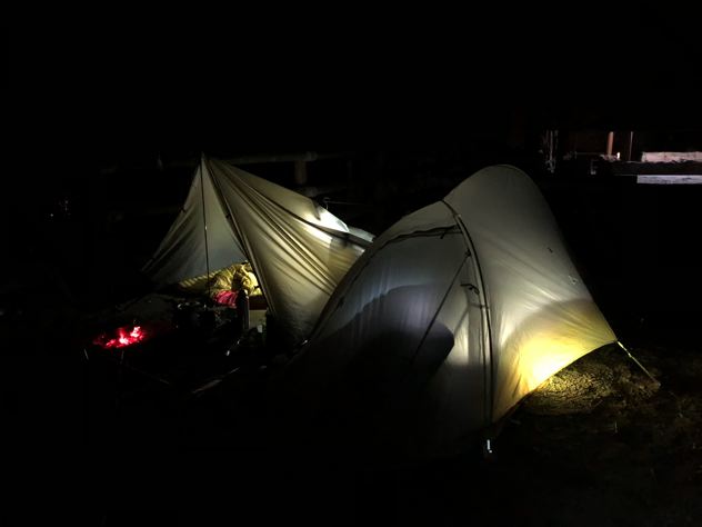 ニンジャタープでのタープ泊は初めてだったので1時間位どの形にするのか?から始まって、悪戦苦闘の末この形に落ち着きました。風は強いし、超寒いし、既に疲れた!