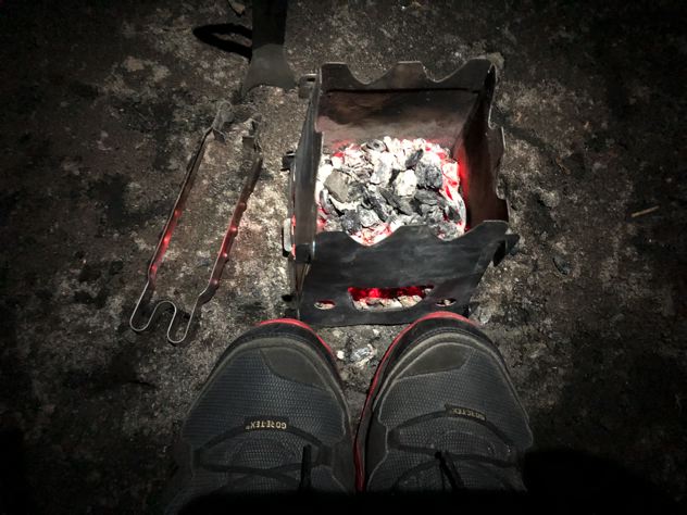 最後の最後はエンバーリットに熾火集めて、足先を温める。