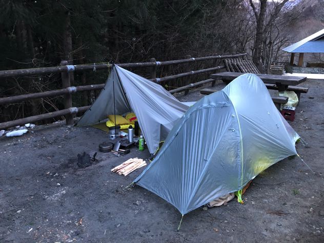 夜中に「ゴ〜」ってゆ〜不気味な音が発生してました。強風の知らせです。その音の後に強風が吹きつける状態を何度か繰り返し。剥き出しタープはきつかった〜。