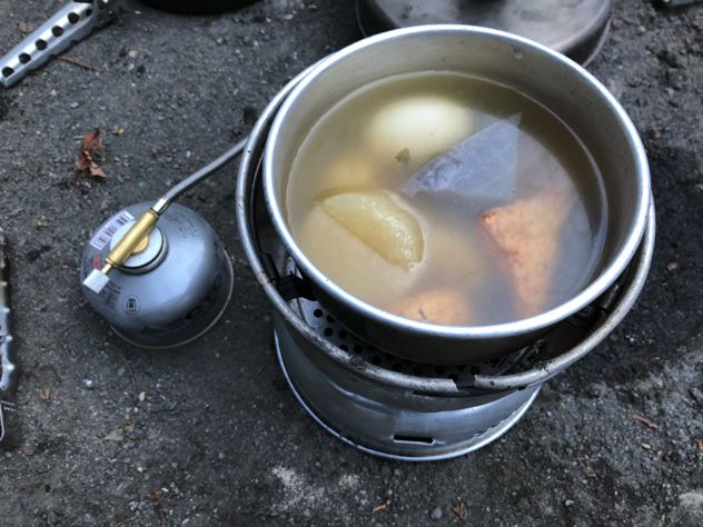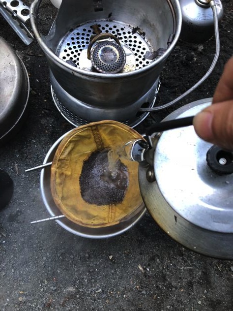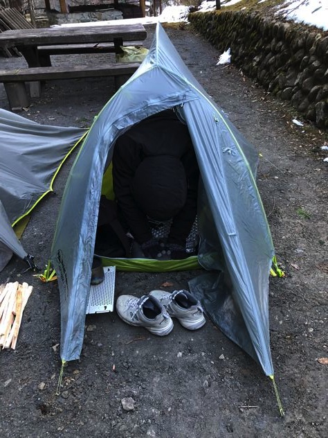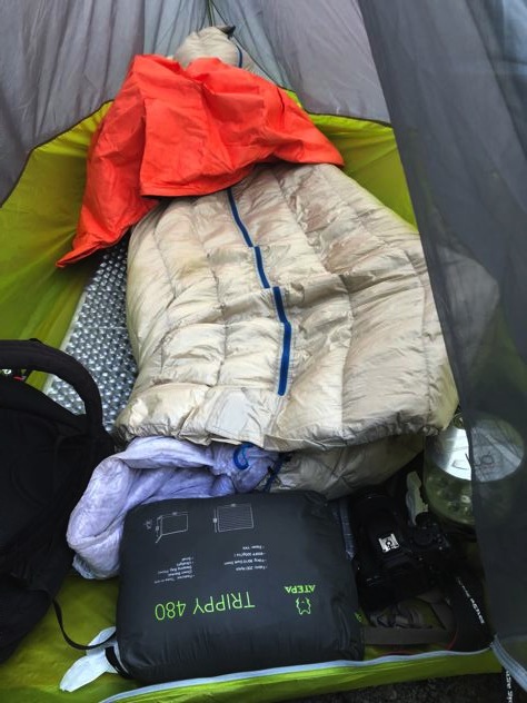ミスターがもぞもぞと起床。ミスターの寝具はサーマレストのパタパタ銀マットにウインドハードとネイチャーハイクとエスケープビビィ。寒かったらしいがアテパも出して包めばよかったのに枕にしてたみたい。笑