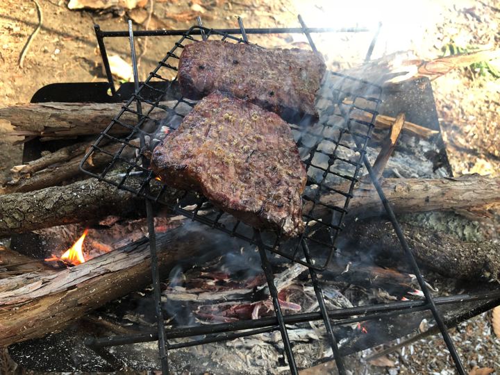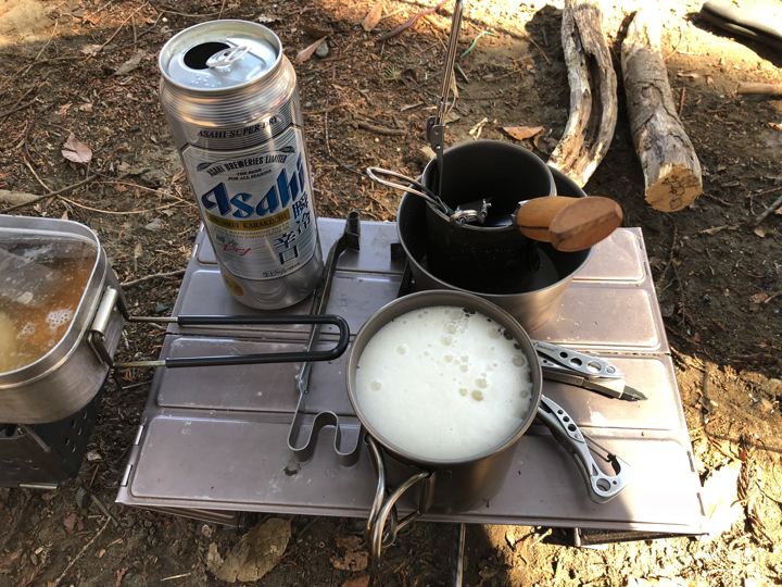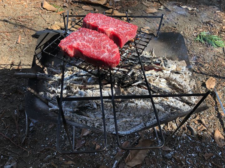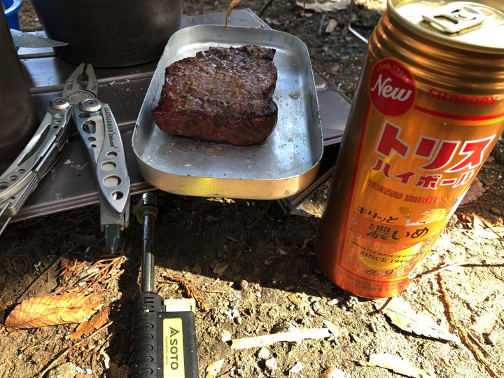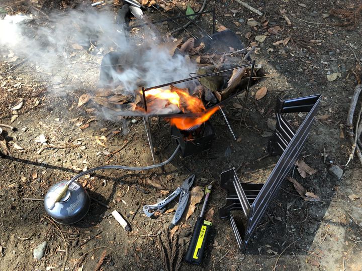 風が強かったので、テーブルを風防にしてガスバーナーでピコグリルにファイヤー!