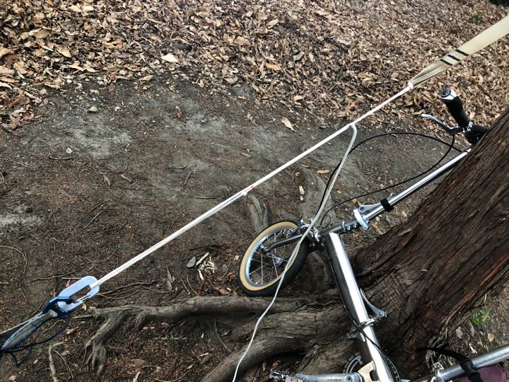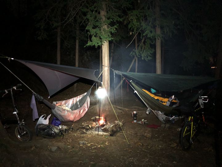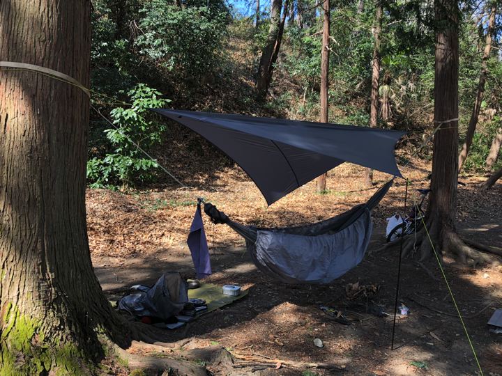 今回のハンモック装備は、ハミングバードのツリーストラップでシートゥサミットのULハンモックを張り、下からサーマレストのハンモックウォーマー。タープは、ギアトップさんの本当はグランドシートタープ中間サイズ。
