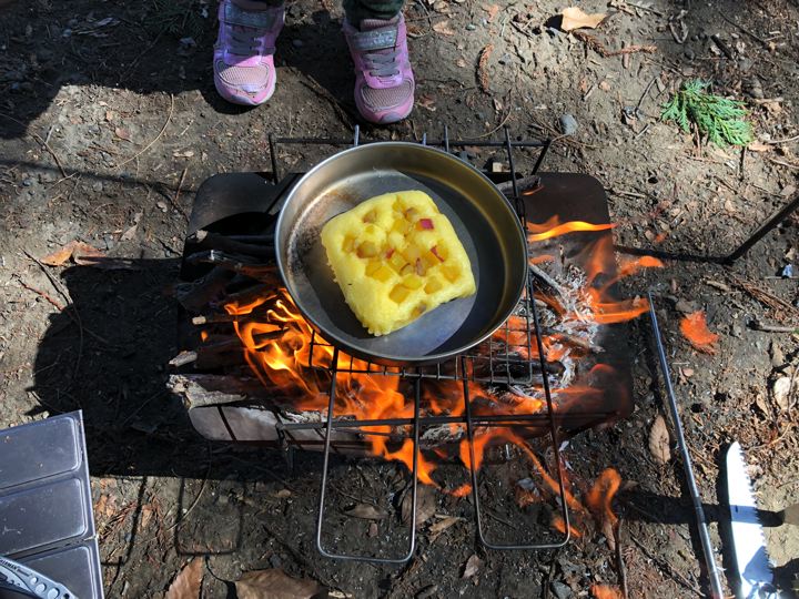 ちびっこ用に蒸しパンを焚火焼き。ちびっこ、じ〜っと見つめながら待つ。