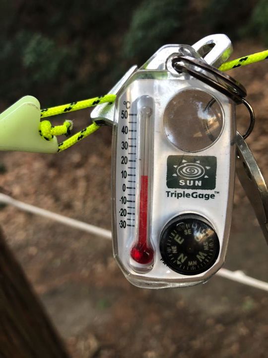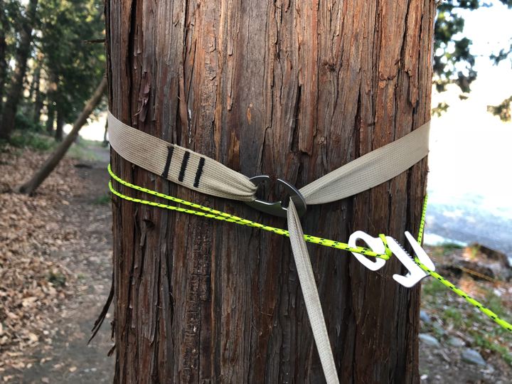 ツリーストラップとダッチクリップのコンビは最強。タープのガイラインは、へんてこ自在金物にしてみましたがこれも良い。