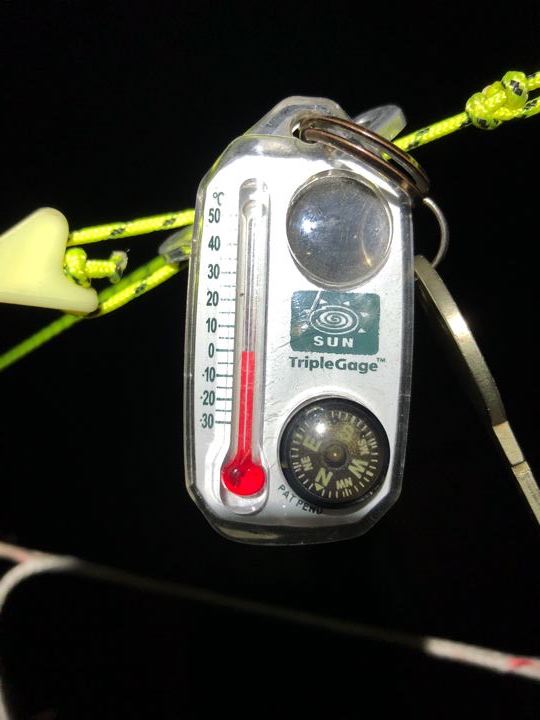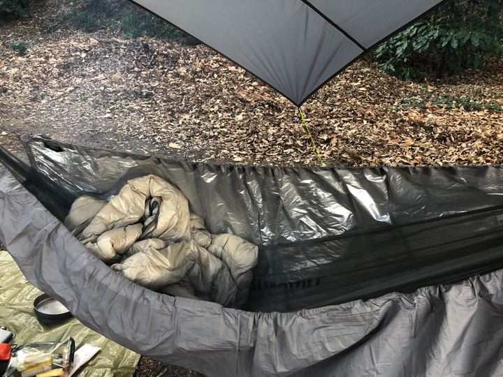 防寒対策は、下からハンモックウォーマー(グレー/シルバー)、スケスケハンモック(グレー)、シュラフはネイチャーハイクの白蓑虫(白)、タープはギアトップ(グレー)。このカラーコーデ、ええやろ。