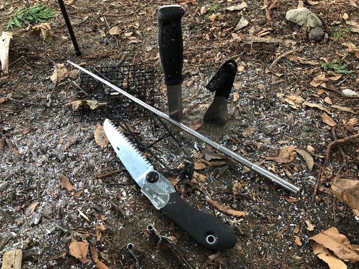 焚火道具も、見ていて飽きない。ノコ、火吹き棒、ナイフ、スコップ。
