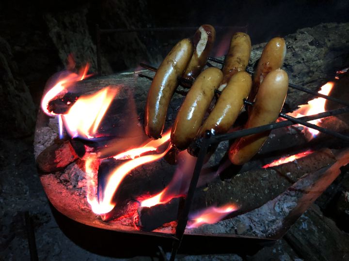 ウインナーをピコグリルのスピットに刺して焚火焼き。うみゃ〜!