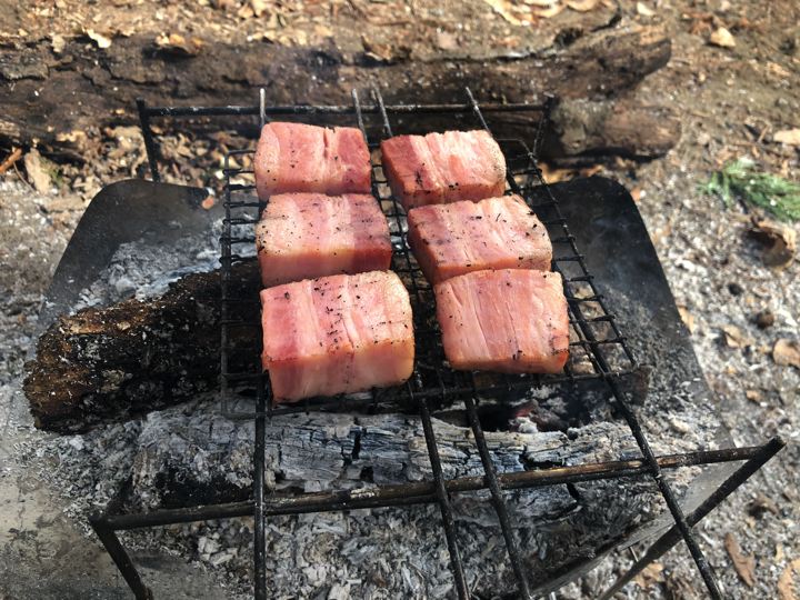 ピコグリルで焚火ブロックベーコン!あまりもんでも、焚火で焼けば、うみゃ〜!
