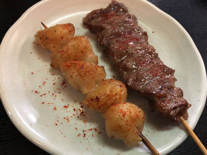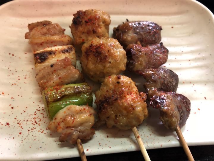 とりあえずセットの焼鳥。ねぎま、つくね、はつ。全部塩にて。うみゃ〜!