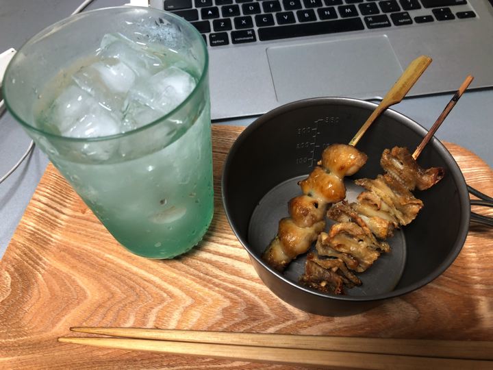 うちに帰って、焼鳥と芋焼酎ロック。この頃は多分「七窪」