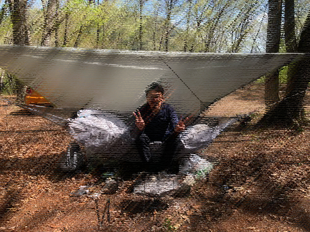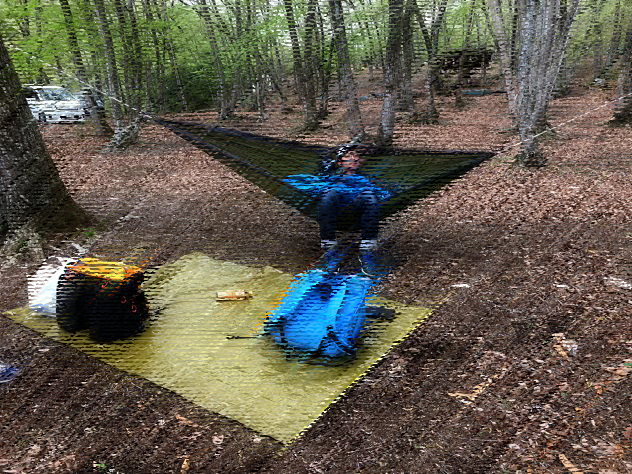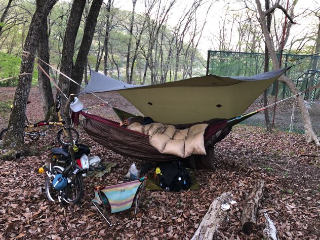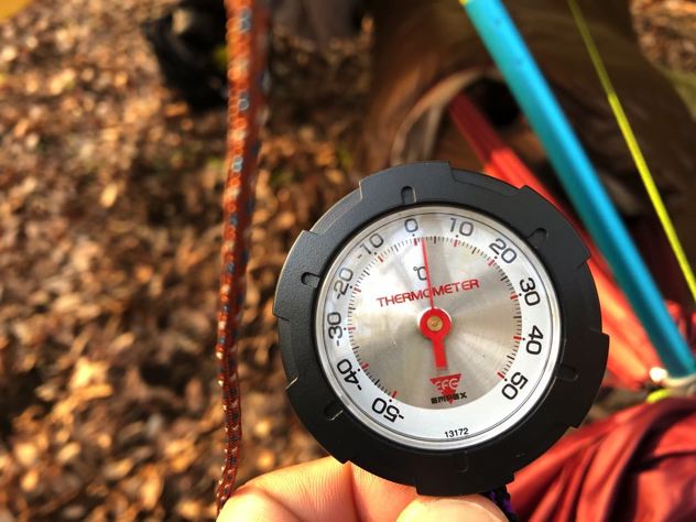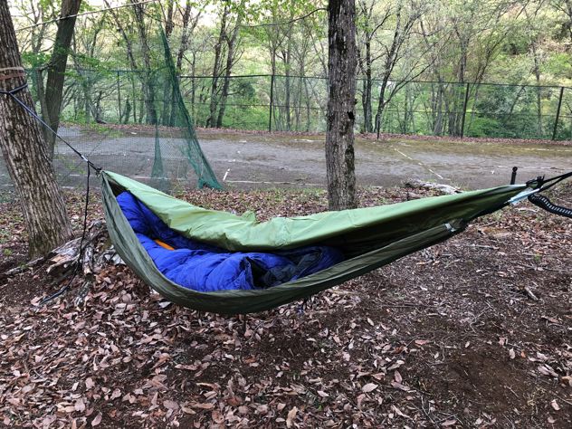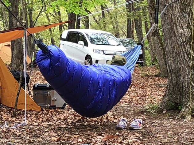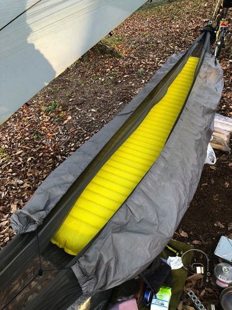 今回の僕ちゃんの断熱は、ハンモックウォーマーにネオエアーX-Light女性用にウインドハードのスケスケトップキルトのみ。