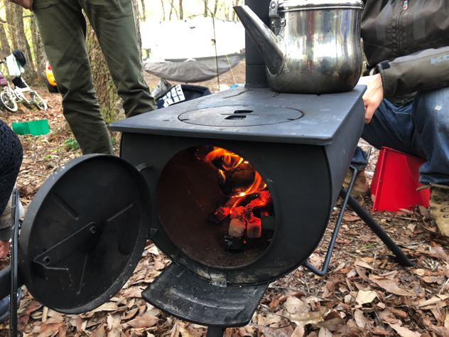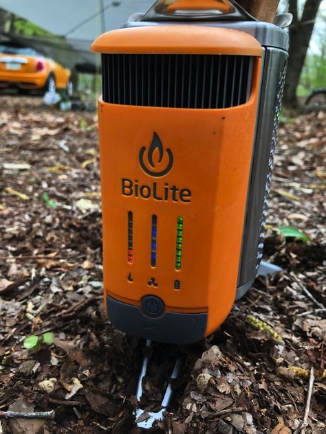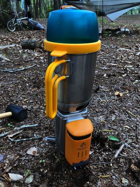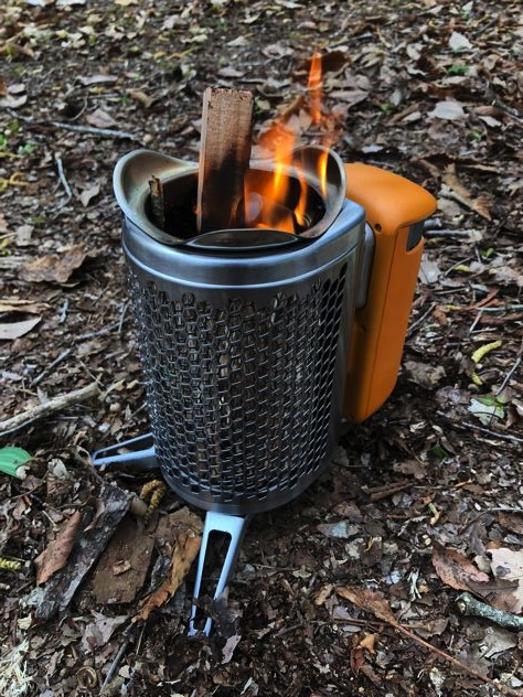 ぶるっちさんがバイオライトで焚火開始。ファンが回って発電しています。