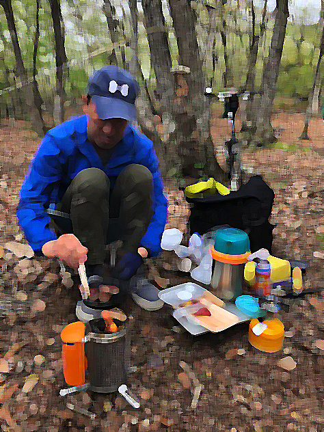 食後にはバイクのお兄ちゃんにウルトラライトギア類の説明を熱く語る。