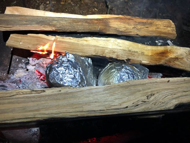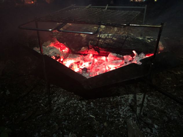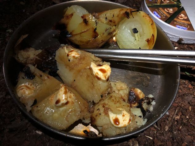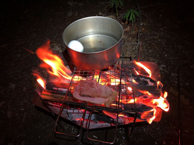 ピコグリルでじゃがいもと玉ねぎのホイル焼きしながら、ゆで卵とハムの網焼きを同時に行なう。上だけで4バーナー位同時に出来ちゃうのは素晴らしい。頑張れば、焚火内にホイル焼き、火床の下でピザ焼いたりも出来ます。