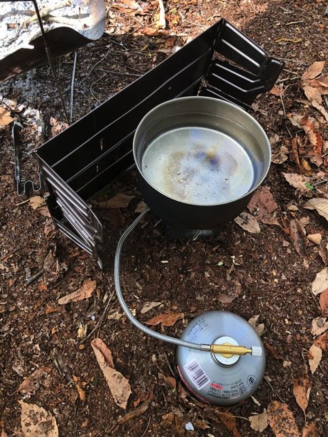 テーブル風防立てて、ファイヤーボックスnanoを五徳にしてブリンのガスバーナーで湯沸かし。
