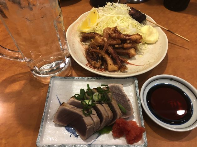 2杯目は芋焼酎お湯割で、ゲソ天と鰹のタタキ。うみゃ~!