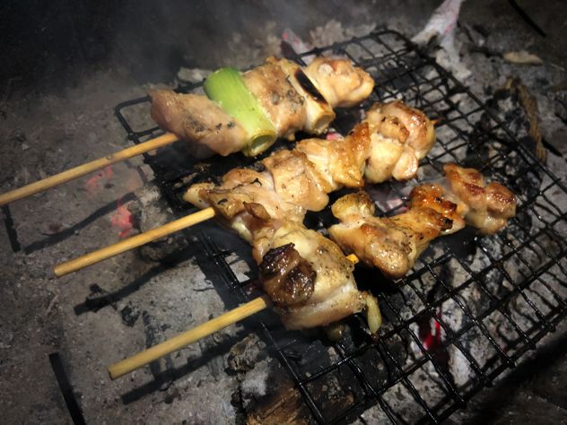 我々親子は焼鳥からスタート。焚火でモートン岩塩焼き。う、うみゃ〜!