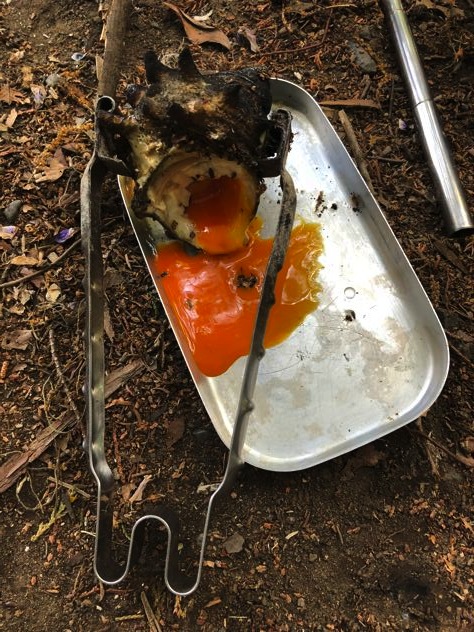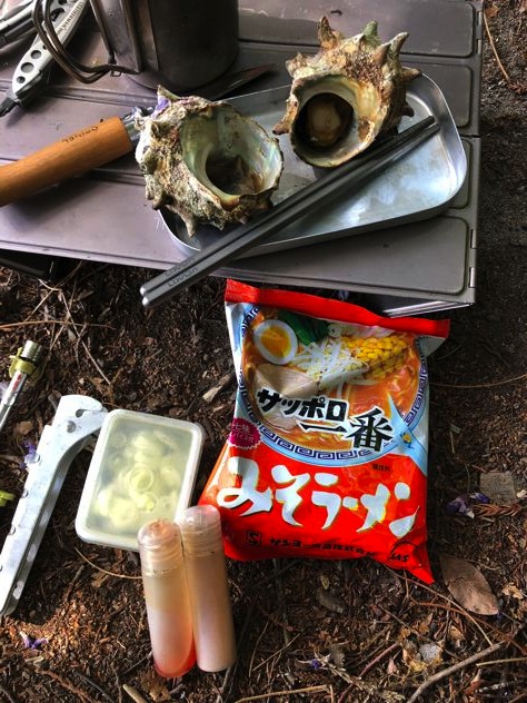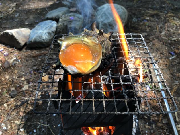 本日のモーニングは、昨夜の残りもののサザエをエンバーリットの焚火でつぼ焼きにして・・・