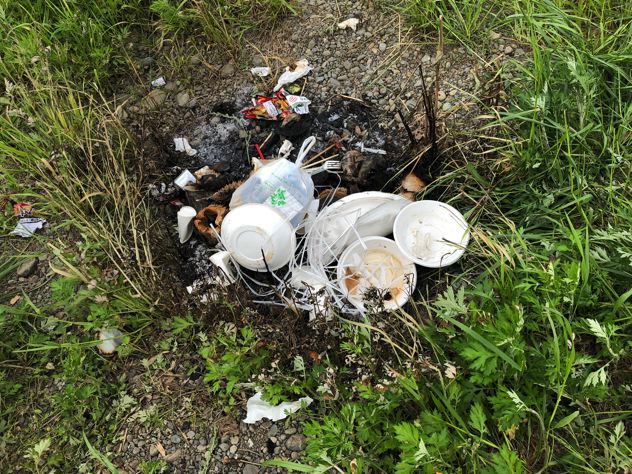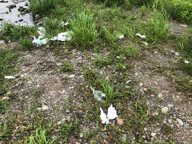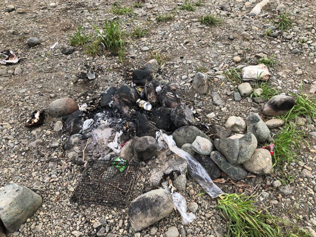 河原はゴミだらけ。直火で、焼き網ごと捨ててある。