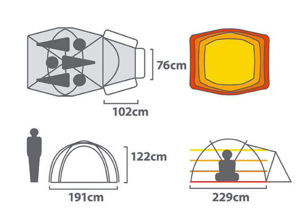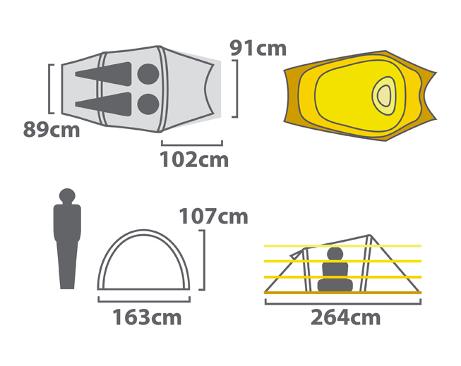 全気候用シェルターは1分以内で設置できる優れ物。エアサポートテクノロジーは、ポールを使わない空気で不膨らます画期的なデザインな のでより軽量に、簡単にセットアップできるテント。 また、とてもコンパクトなので小さなバックパックにも最適。 サイズ 315cm x 112cm 2.2㎡ 前室: 0.6 ㎡ 重量 1.3 Kg 収納サイズ 20cm x 18cm 1.4 Kg 材質等 フロア: 30 D PU ナイロン ウォール: 40 D Osmo Waterproof/Breathable フライ/前室: 30 D Sil/PU ナイロン ポール:AST 1 エアビーム (直径5cm) |