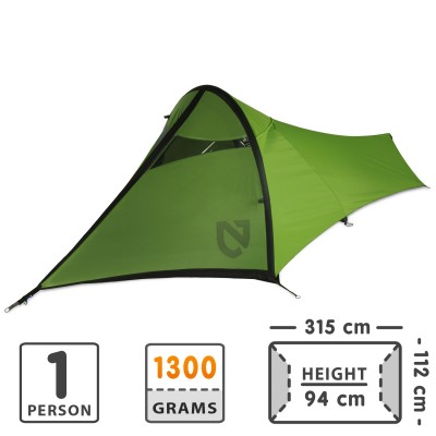 夜間や雨の中でも簡単設置ができ、とにかくテントの長さがゆとりで寝れるのが凄い。重さ約1.5キロのユニークな形状。他のNemo(ニーモ)のものに比べて中が広く、天井部分が高いのが特徴。ポールではなく、エアーチューブを使用しているのが軽さの秘密。修理キット、ポンプ、ステイク(ペグ)、収納袋付き。