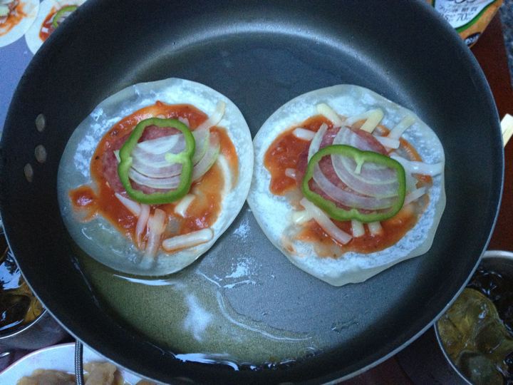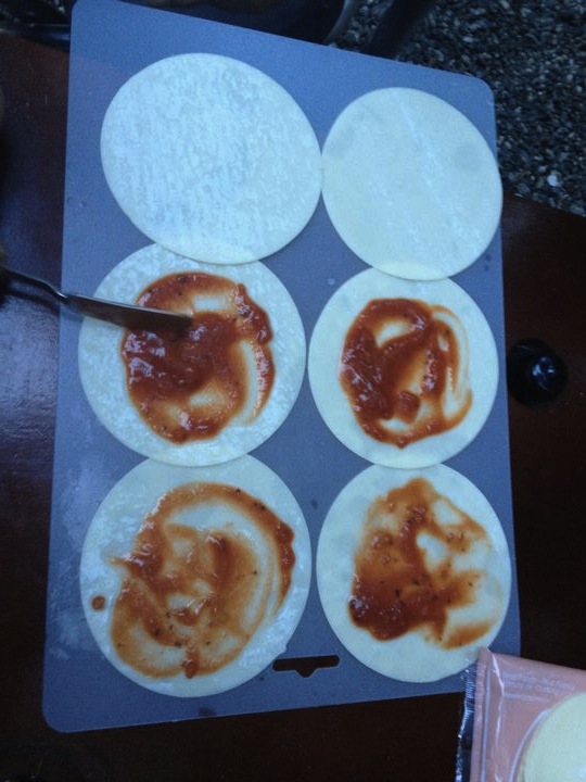 ゆったんは、餃子の皮の一口ピザを焼く。