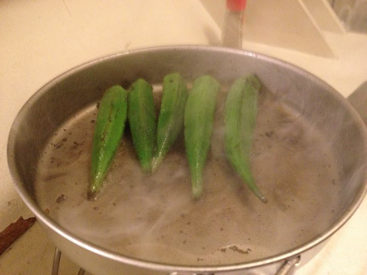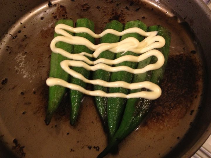 オクラが余っちゃったから、炒めてマヨネーズかけておつまみに。