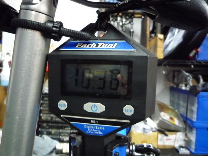 O-dotサスとサイコン装着後、再び体重測定。10.6kg。