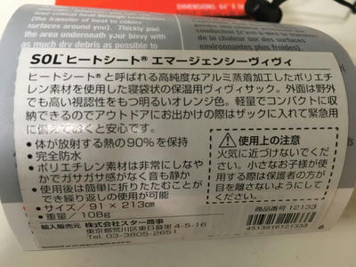 いわゆる非常用の寝袋です。気温にあわせてこれだけで使ってもいいですし寝袋とあわせて使ってもOK。シュラフカバーとしても重宝しますね。最軽量のSOLヒートシートエマージェンシーヴィヴィが到着。重さ108g!しかし今回はもってきません。笑