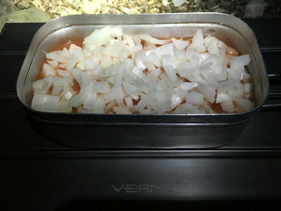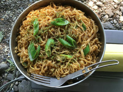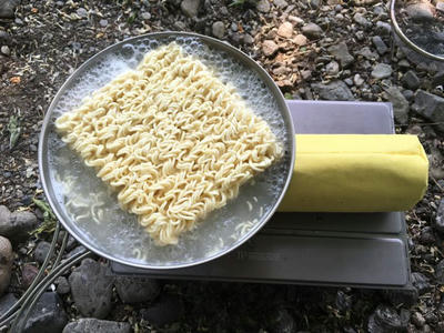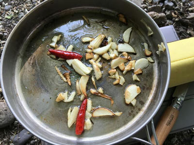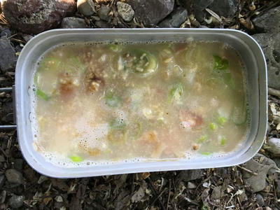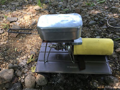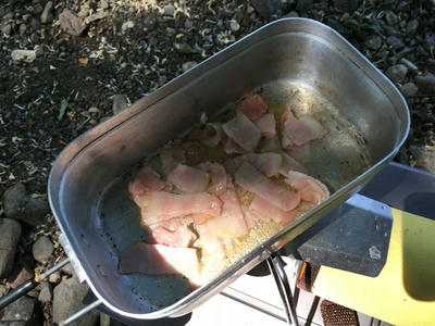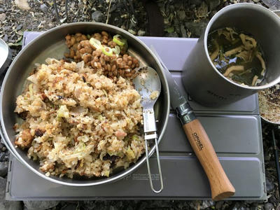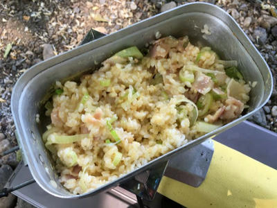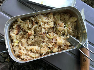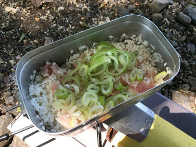 で、モーニングの準備へ。メスティンで作る「いきなりチャーハン」です。