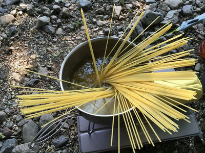パスタは茹でる時に、ねじってぽんすると自動的に広がります。