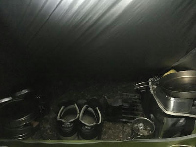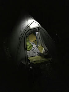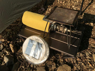 照明はブロちゃんで日常的に使ってるキャットアイのVolt300にモンベルのくしゃくしゃ紙の行灯をつけたやつ。結構明るく、光が広がるので優れものです。