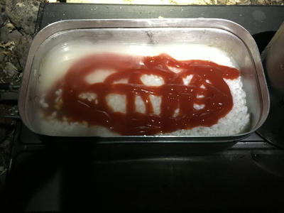 吸水したお米にコンソメと塩とケチャップとバターを入れて混ぜます。