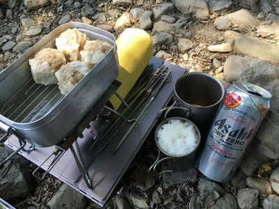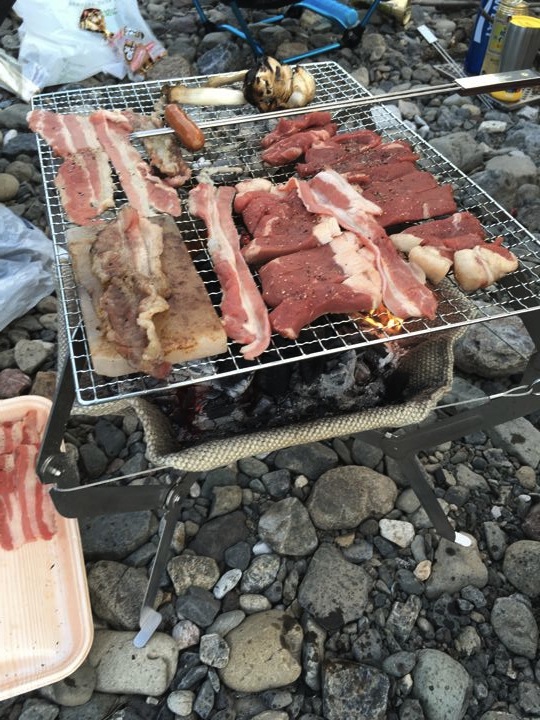 リョウさんは自作の焚火台でもつ焼き?これカッコいいです。
