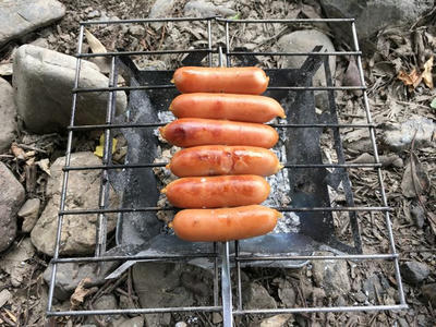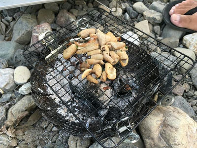 おやつにもらったウインナーを焚火で焼きます。うみゃ〜!