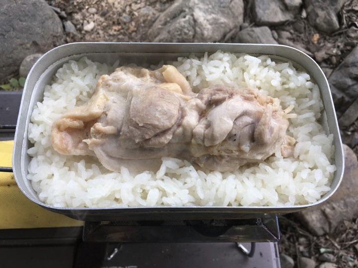 皆さんがガサガサと撤収中にやっと朝ご飯の支度です。カオマンガイの素。既製品でやるのは初めて。