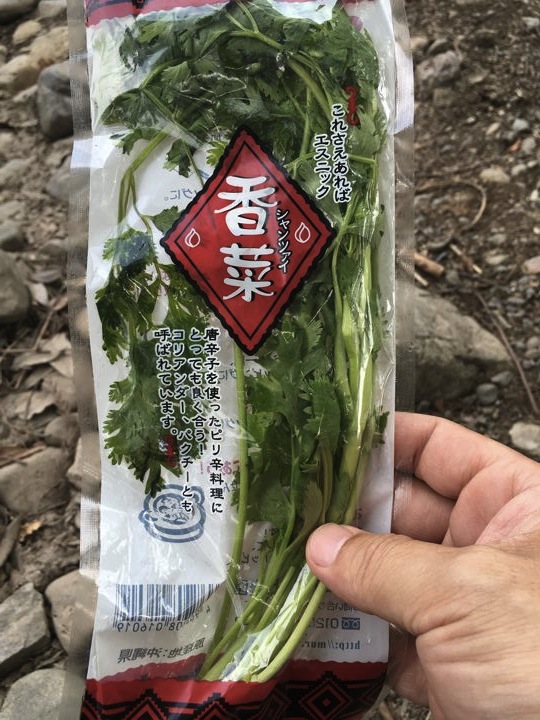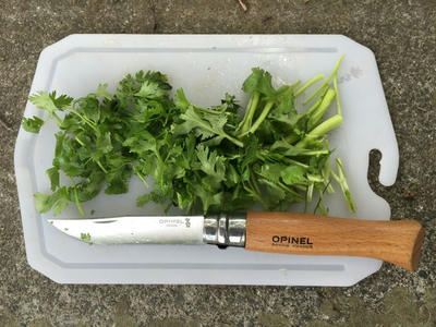 パクチーをウルトラライトぺらぺらまな板にてオピネルで、カット!