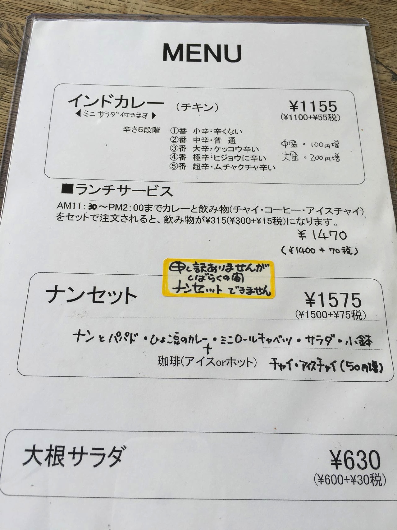 インドカレーにチャイを頂きましたが、高い割にイマイチでした。ぬ〜